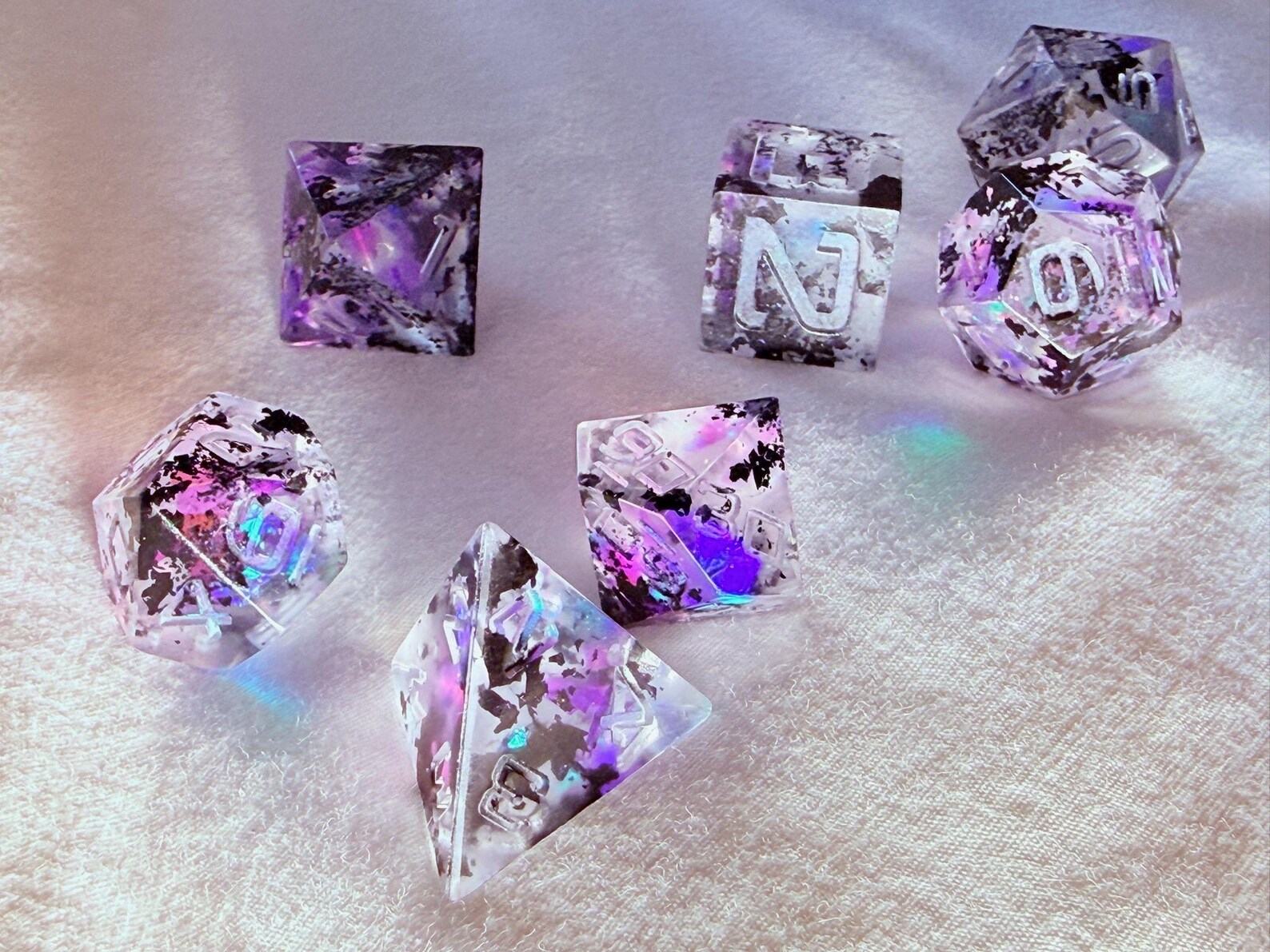 Midnight Hatter is formal chaos dressed for ritual. Dark resin, fractured light, and kaleidoscopic interference pull the set toward something theatrical, decadent, and slightly dangerous. It does not grin politely. It grins with intent.